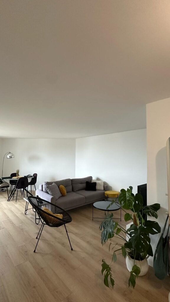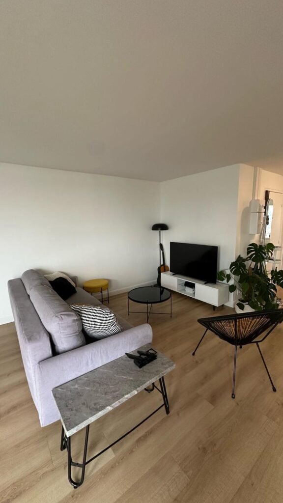 Le salon, devenu lumineux et spacieux, s'harmonise parfaitement avec la cuisine moderne aux lignes épurées. L'espace de vie a été optimisé pour créer une atmosphère chaleureuse et contemporaine, où chaque détail a été soigneusement étudié pour allier esthétique et fonctionnalité.